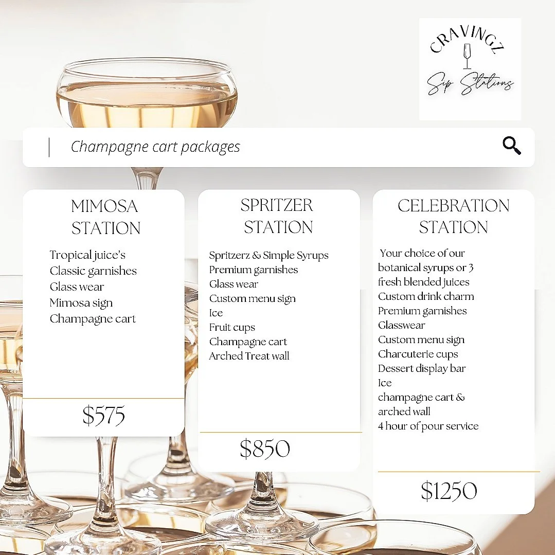 Cravingz loves making cozy intimate environments for special occasions, We bring that by adding our champagne cart to any event for a beautiful picture worthy set up and elegant experience to all occasions. Simple elegant set up with self-service options great for mimosa bars and welcome drink stations for all events.